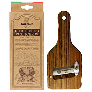 落ち着いた色合いの木製トリュフスライサー。ご自宅でトリュフのけずりたてをお楽しみ頂けます。ステンレスの刃の部分にソルレオーネ・ビオ社のロゴが刻印されています。0.2mm~3mmでスライスの厚みを調整出来ます。(長さ:約20cm、幅:約9cm)