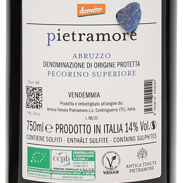 2023年7月ピエトラモーレ社マリア ピア レオーネさんにお話を聞きました。「アブルッツォでは、近年ペコリーノの人気が高まっています。当社でも一番人気なのはペコリーノ。私たちのペコリーノは、赤ワインのふりをしている白ワインとも言われます。アルコール度数は14%と高めで、アロマや味わいには凝縮感が感じられ、長期熟成に向いています。黄桃やアーモンド、海を感じるミネラリーなアロマを持つ厚みのあるペコリーノです。ニューヨークタイムズでは、2016年、2018年が優れた白ワインに選ばれました。」