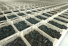 9月に収穫して約100~110日、ここでアッパッシメント(陰干し)を行います。乾燥日数はヴィンテージによって変わりますが、良いブドウほど短めの陰干しになります。陰干しをすることで約30~40%の水分が失われます。 アッパッシメントの品質を上げるため、陰干しのためのスペースを広げ、環境を良くしました。ブドウを広げる入れ物は、より風通しがよく、清潔な穴あきのプラスティック製のカゴを取り入れています。(訪問時は陰干し期間ではないためこの穴あきカゴが高く積まれた状態でした。) |