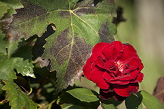 シンボルマークはバラの花。ブドウ樹の列の両端には必ずバラの樹が植えられている |