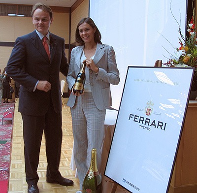| イタリアの高級スパークリングワインフェッラーリ。 色々なファッション誌などでもイタリアブランドのパーティなどというと、見かけたこのラベル。 どんなスパークリングなのかと気になっていました。 今回、そのフェッラーリ社の試飲会で、 直接オーナー一族のマネオルネリさん、カミラルネリさんの お話を聞くことができました。 |