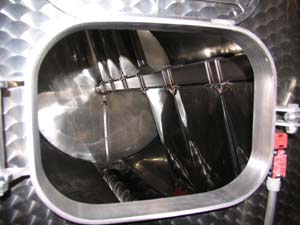 そして、今回、初めて見ることができたのが、横型の発酵ステンレスタンク。通常縦型の発酵ステンレスタンクはよく見かけますが、横型は初めて見たので興味津々で話を伺いました。