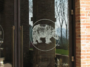 カンペの丘のふもとに、落ち着いた雰囲気の新しいカンティーナ。車を降りて近づいて行くと、大きな木枠の扉の透明なガラスの扉に