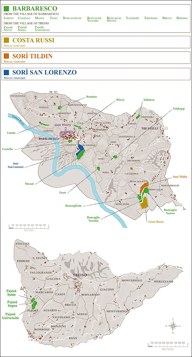 (↑ガヤのバルバレスコの畑。バルバレスコ村に3つの単一畑「ソリ サンロレンツォ Sori San Lorenzo」、「コスタルッシ Costa Russi」、「ソリ ティルディン Sori Tildin」。そして「ベルニーノ Bernino」、「ロレート Loreto」、ワイナリーに近い「ブリッコ Bricco」と「カステッロ Castello」、ソリ サンロレンツォに隣接する「マスエ Masue’」、そして「トリフォレラ Trifolera」、「ヴァルドラップ Valdrapp」、「ファセット Faset」、「ロンカリエッテ Roncagliette」、「ロンカリエ ヴェッキオ Roncaglie Vecchio」、「ロンカリエ ヌオーヴォ Roncaglie Nuovo」。さらにトレイゾ村の「パヨレ ソット Pajore Sotto」、「パヨレ ソープラ Pajore Sopra」、「パヨレ ウニヴェルシタ Pajore Universita’」。全部で14の畑をブレンドして造られます)