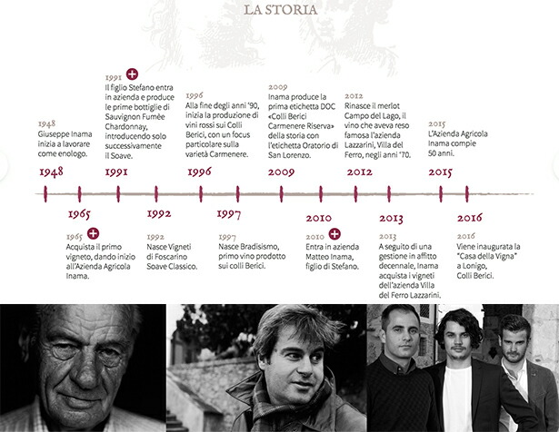 私の祖父のジュゼッペ イナマが第二次世界大戦後、トレンティーノからヴェローナに移り住み、ソアーヴェクラシコエリアの「アンセルミ」でワイン造りを始め、35年間働きました。アンセルミを務めた後、1970年代にソアーヴェクラシコ中心部に位置する「フォスカリーノ」に畑を購入し、祖父は休むことなく毎日畑を耕していきました。祖父の努力が今に繋がっています。「小さな犠牲であれば、結果も小さなものだが、大きな犠牲が大きな結果を産む」事をジュゼッペは私達に身をもって示してくれたと思っています。