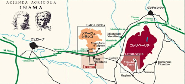 フォスカリーノは、ソアーヴェクラシコのエリアの中で歴史的に最上級とされる丘陵地。約65ヘクタールをイナマとアンセルミ、ジーニの3社が所有。そのうちイナマは最も標高が高い最良部分の傾斜地に28ヘクタールを所有しています。ここに畑を持っていることがイナマの最大の強みです。フォスカリーノがソアーヴェ最上級と言われることを裏付けることの一つが2000年前からここでブドウが造られていた事実。ギリシャから南イタリアに伝わったワイン造りが北イタリアへと向かった古代ローマ時代、当時の品種に適した火山性土壌の土地はここソアヴェのフォスカリーノだけでした。30%新樽を使い醗酵、熟成をしています。畑は火山岩土壌で南、南東、南西を向いています。父のステファノがソアーヴェクラシコで初めて新樽を使いました。オレンジ色になるで完熟したブドウとバランスを取りながら、新樽の風味をどれくらい聞かせるかは年毎に調整しています。ですので、そこまで新樽の強い香りではありません。 |