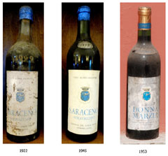 この写真は1922年のボトルです。1935年には醸造所を整備し、本格的に自社のワインをボトル詰めして販売することを始めました。これは当時としてはとても珍しく、コンティゼッカはプーリアで最も早く品質を追求するワイナリーとしての一歩を踏み出したのです。1955年には「ドンナマルツァ」ブランドでボトリングを始めています(左から1922、1945、1953年の自社詰めワイン)。