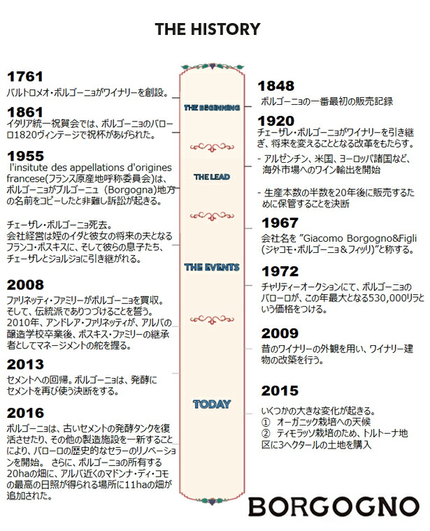 その時私はまだ18歳で、まだアルバの醸造学校に通っていました。ボルゴーニョ社を購入した時の哲学は「何も変えない」事でした。しかし私は何も変えない為に、全てを変えました。矛盾しているようにも聞こえますが、ボルゴーニョ社が伝統的に行いその名声を築いたクラシックな醸造スタイルに戻しました。