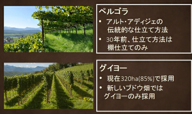 歴史的にみると、アルトアディジェでも他の北イタリアの産地同様、赤ワインが主流でした。赤ワインは人々の生活にとってのカロリー源でしたから必然的に赤ワインの生産量が多かったのです。 |