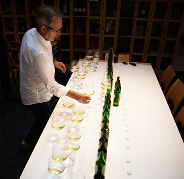 別々に醸造熟成させた樽の中から良い樽のものだけを選び、それぞれサンプルとしてボトリングをします。テイスティングはこのサンプルワインをテーブルに並べて判断していきます。だいたい40ぐらいのサンプルが並びます。それをひとつずつ試飲して美味しかったものをその程度によって自分のそばに置きます。その距離が近いものほど美味しいということになります。結果、約半分ほどのボトルがアッピウスの候補になります。翌日、選んだボトルを再度試飲し、最終的にブレンドを決めます。アッピウスに入るのは24ぐらいのバリックまたはトノーになりますね。アッピウスには選ばれなかったものはサンクトヴァレンティンの方に回します。少しの量ではありますが、サンクトヴァレンティンのレベルを上げています。