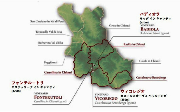 これらのサブゾーンで造られるグラン セレツィオーネは3本とも実にテロワールの違いが表現されています。カステッロ フォンテルートリは骨格と複雑さのバランス、バディオラは素晴らしいエレガントさ、ヴィコレジオは力強い凝縮感が与えられます。