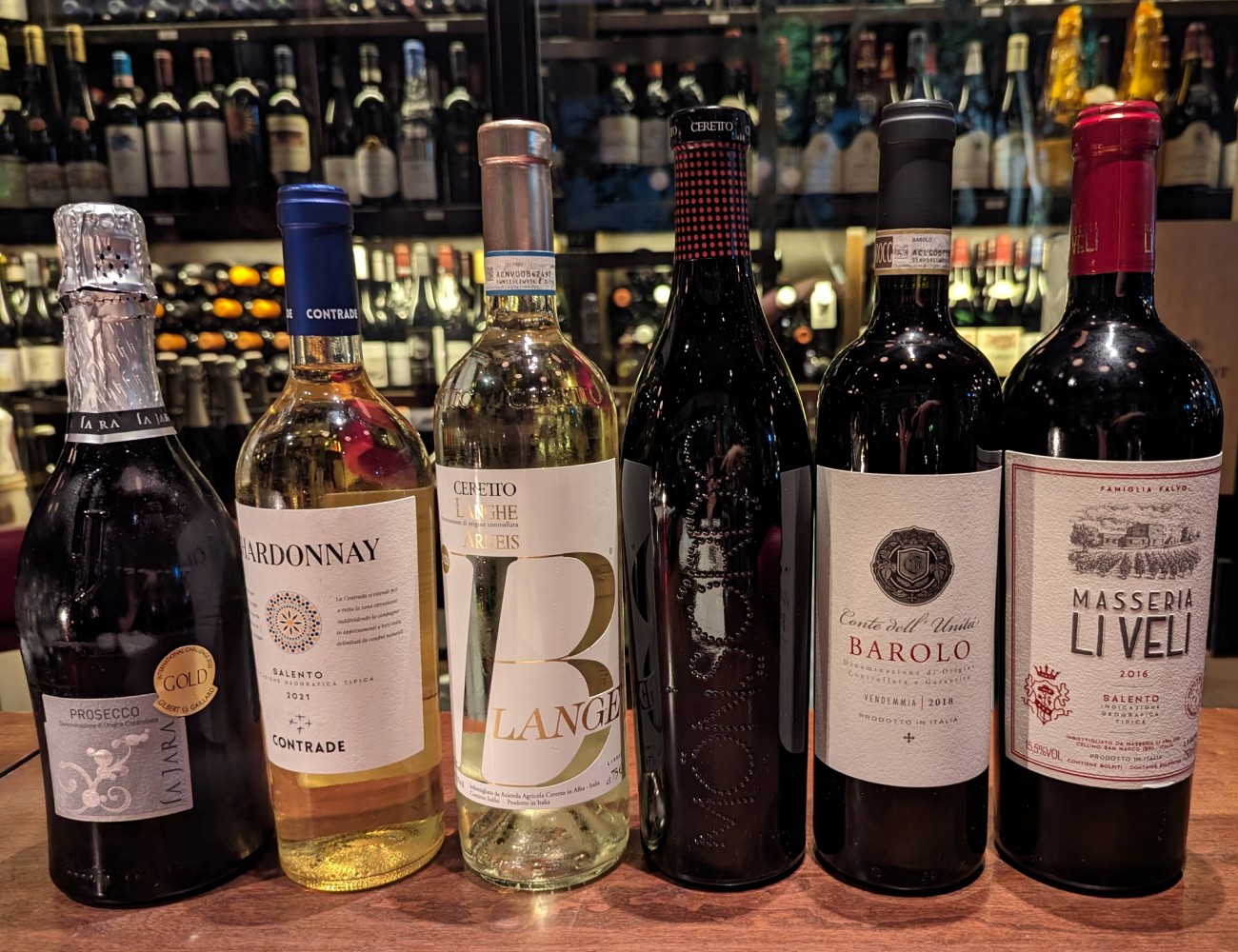 | 試したワインは次の6種類。「ラ ジャラ プロセッコ スプマンテ ブリュット」、「マッセリア リ ヴェリ コントラーデ シャルドネ プーリア 2021」、「チェレット アルネイス ブランジェ 2021」、「テロワール チェレット バローロ コンテ デル ウニタ 2018」、「チェレット モンソルド ランゲ ロッソ 2020」、「マッセリア リ ヴェリ マッセリア リ ヴェリ 2016」。