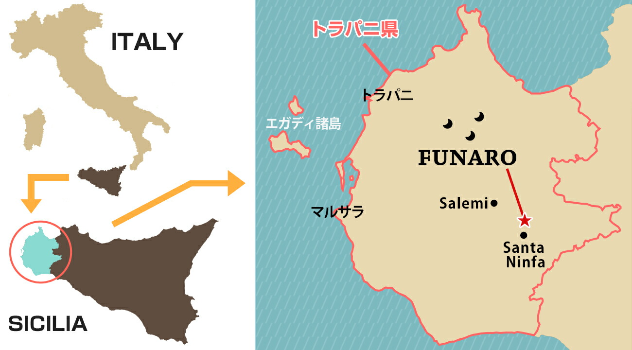 クレメンテ みなさん、こんにちは。私はクレメンテ フナロです。フナロは、シチリア北西部トラパニ県に拠点を置く家族経営ワイナリーです。シチリアは、古代ギリシャ時代から文化の発展を遂げてきたイタリア最大の州です。