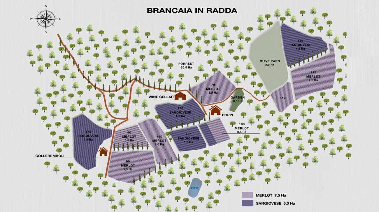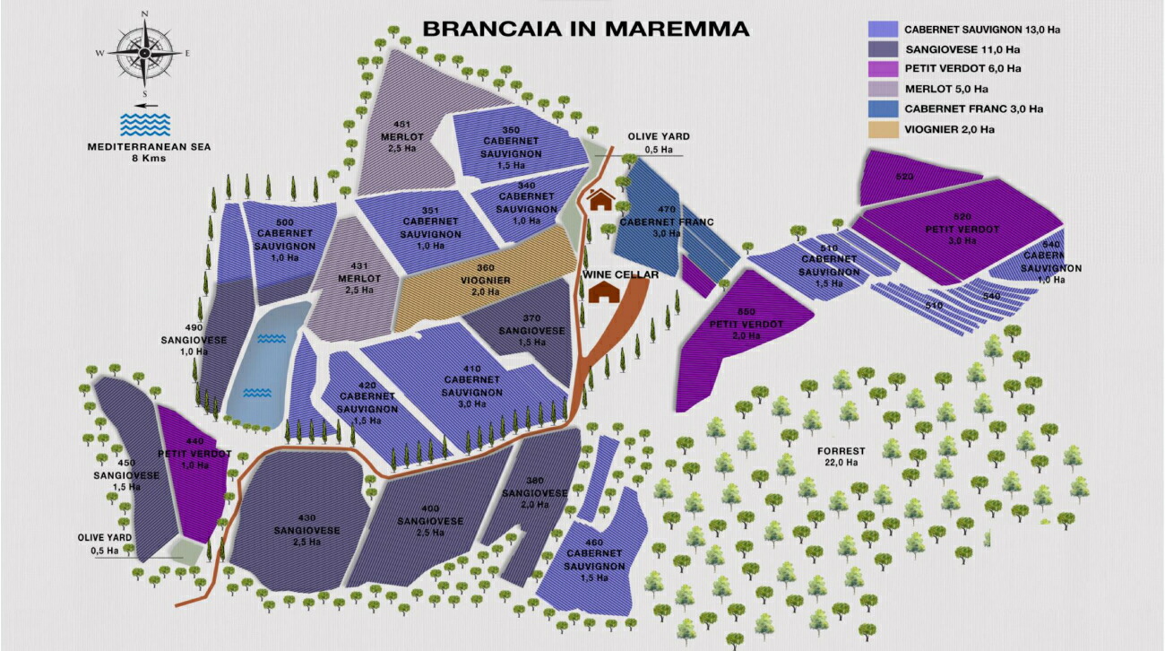 ダレッシオ そうです。ラッダでの醸造が始まりです。1998年にマレンマの畑も取得し、醸造所も建設して、3箇所目となるワイン生産が始まりました。醸造所はラッダのものより2倍以上の大きさです。キャンティ クラシコはラッダで、マレンマのワインはマレンマで醸造しています。ですので、ご存知の通り畑はカステッリーナ、ラッダ、マレンマに所有しています。 ![]() ——畑はそれぞれ何ヘクタールありますか? ダレッシオ キャンティ クラシコ地区は50ヘクタールですが、最近ラッダの近くに13ヘクタールの畑を取得しました。マレンマは40ヘクタールです。畑の図をご覧ください。カステッリーナ、ラッダ、マレンマと同じ農場の中でも場所によって土壌の性質が違うので、各地区に適した品種を植えています。 サンジョヴェーゼの単一畑グランセレツィオーネが造られるカステッリーナ ダレッシオ カステッリーナは非常に品質の高いサンジョヴェーゼが生まれる場所です。これまで私たちは地域や畑のブレンドをして造ってきましたが、2019年に初めて造ったグランセレツィオーネはカステッリーナの単一畑からできています。他には、カベルネ ソーヴィニヨン、ソーヴィニヨンブラン、メルローが植えてあります。 ![]() 「イル ブルー」の最高品質メルローが生まれるラッダ ダレッシオ 一方、ラッダはメルローの品質が高いです。フラッグシップのイル ブルーのメルローはラッダで造られています。実はサンジョヴェーゼも素晴らしく、最近取得した13ヘクタールの畑はサンジョヴェーゼが植えられています。その年の出来によってはグランセレツィオーネは、その畑から造られるかもしれません。栽培する品種はその2種類。醸造所がないカステッリーナのブドウは、ここラッダで醸造しています。 ![]() スーパータスカン「イラトライア」に使用される国際品種に最適なマレンマ ダレッシオ マレンマの畑も見てみましょう。ご覧の通り、ほぼ国際品種です。キャンティ クラシコ地区と異なり、地中海性気候で海風が常に吹くので、高品質なカベルネ ソーヴィニヨンやプティヴェルドが生まれます。私たちのトップワイン、スーパータスカンの「イラトライア」は、マレンマのプティヴェルド40%、カベルネ ソーヴィニヨン40%、カベルネフラン20%で造られます。『ワインスペクテーター』のTOP20にランクインするようなワインです。 これら3地区の畑から3つの品種(サンジョヴェーゼ、メルロー、カベルネ ソーヴィニヨン)を組み合わせて2000年に誕生したのがエントリーラインの「トレ」です。 ![]() |