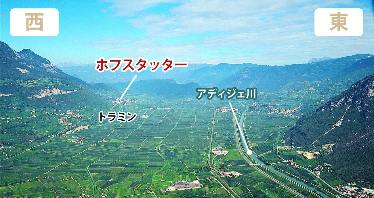 写真を見てわかる通り、拠点を置くトラミンは切り立った山の急斜面に挟まれています。所有畑は、川を挟んだ両方の急斜面に点在しており、主にピノ ネロは東側、ゲヴュルツトラミネールは西側で栽培しています。両者は3kmしか離れていませんが日照量は年間で1000時間も異なります。太陽の動きと畑の向きから、東側は冷涼で西側は温暖です。