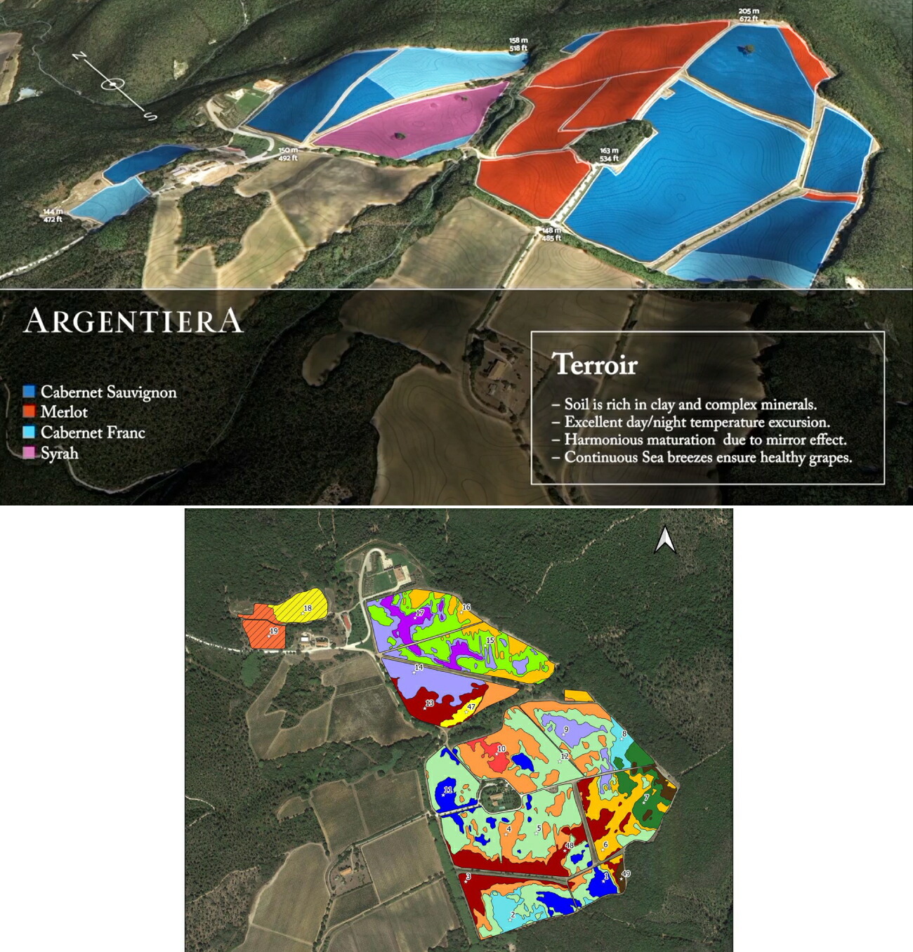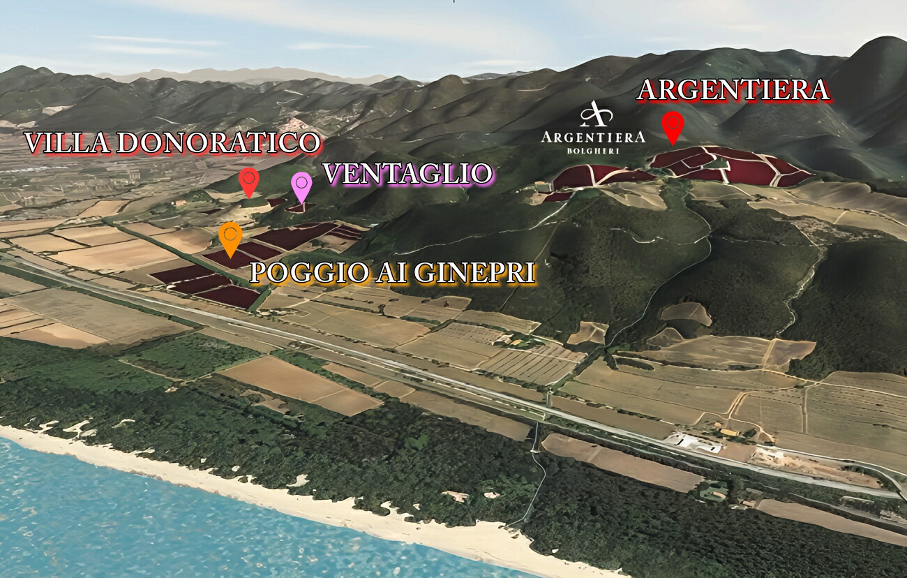 アルジェンティエラはボルゲリ地区の最南端に位置し、主に丘陵地と、海に最も近い畑を所有しています。一般的にボルゲリは南北よりも東西での差が大きく、アルジェンティエラは標高の違いによる異なるテロワールを有しています。また、森に囲まれ、ブドウ畑以外にも豊かな自然が多いため、有機栽培においても好条件が揃っています。