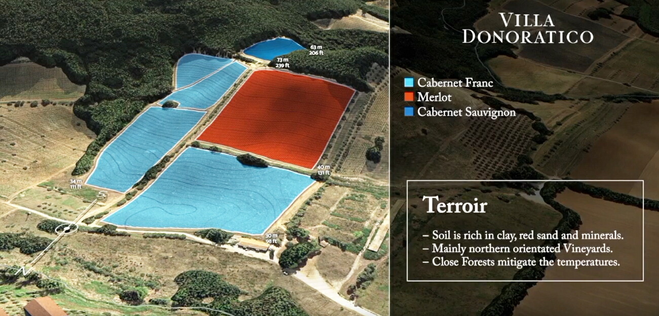 | マッシモ氏: 「ヴィッラ ドノラティコは日照条件が良好な南向きの2区画を除いて、多くの畑が北向きです。このワインは2003年から造っていますが、当初はバリックの影響が強いワインでした。現在はスタイルを大きく変えて大樽を使用しています。北向きだからこそ生まれるエレガントでフレッシュな風味があります。2021年ヴィンテージはバルサミコやユーカリの香りが特徴的で、タンニンもしっかりしているので15年から20年の熟成ポテンシャルがあります」 |