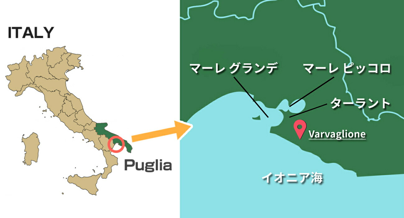 私たちが拠点を置くのは、プーリア州ターラントです。イタリア半島のもう一つの半島のような場所で、北南西の三方の海に囲まれています。また、マーレピッコロ(小さい海)とマーレグランデ(大きい海)にも挟まれているので、「海の街」という別名もあるようなエリアです。そして、海・太陽・風というキーワードも、サレントエリアを形容する大きな要素ですね。それでは、そんな私たちのワインの紹介をしていきましょう。