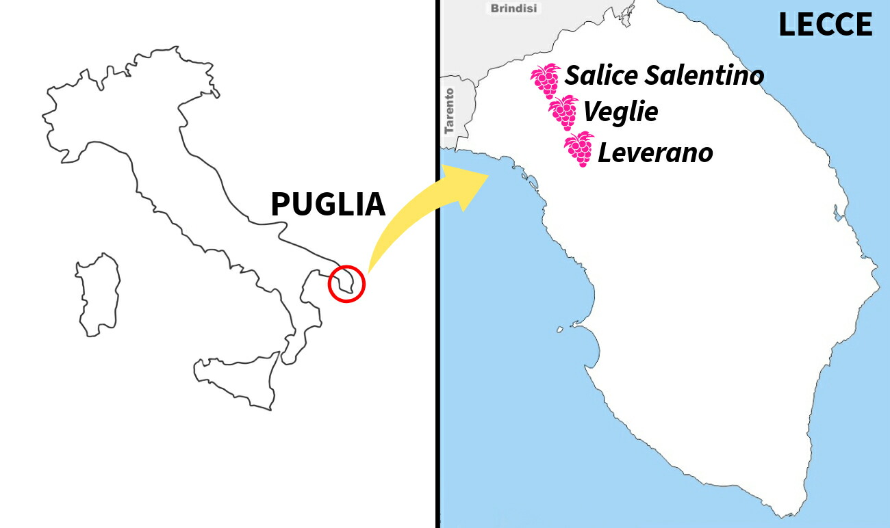 ワイナリーが拠点を置くのは、プーリア州の先端にあるサレント半島レッチェ県です。所有畑は合計約20haで、サリーチェ サレンティーノ、ヴェーリエ、レヴェラーノと3つのエリアに分かれています。いずれもほぼ同じくらいの広さです。サリーチェは深い粘土質土壌、ヴェーリエは石灰砂質土壌、レヴェラーノは石灰と粘土が混ざった赤土の土壌です。