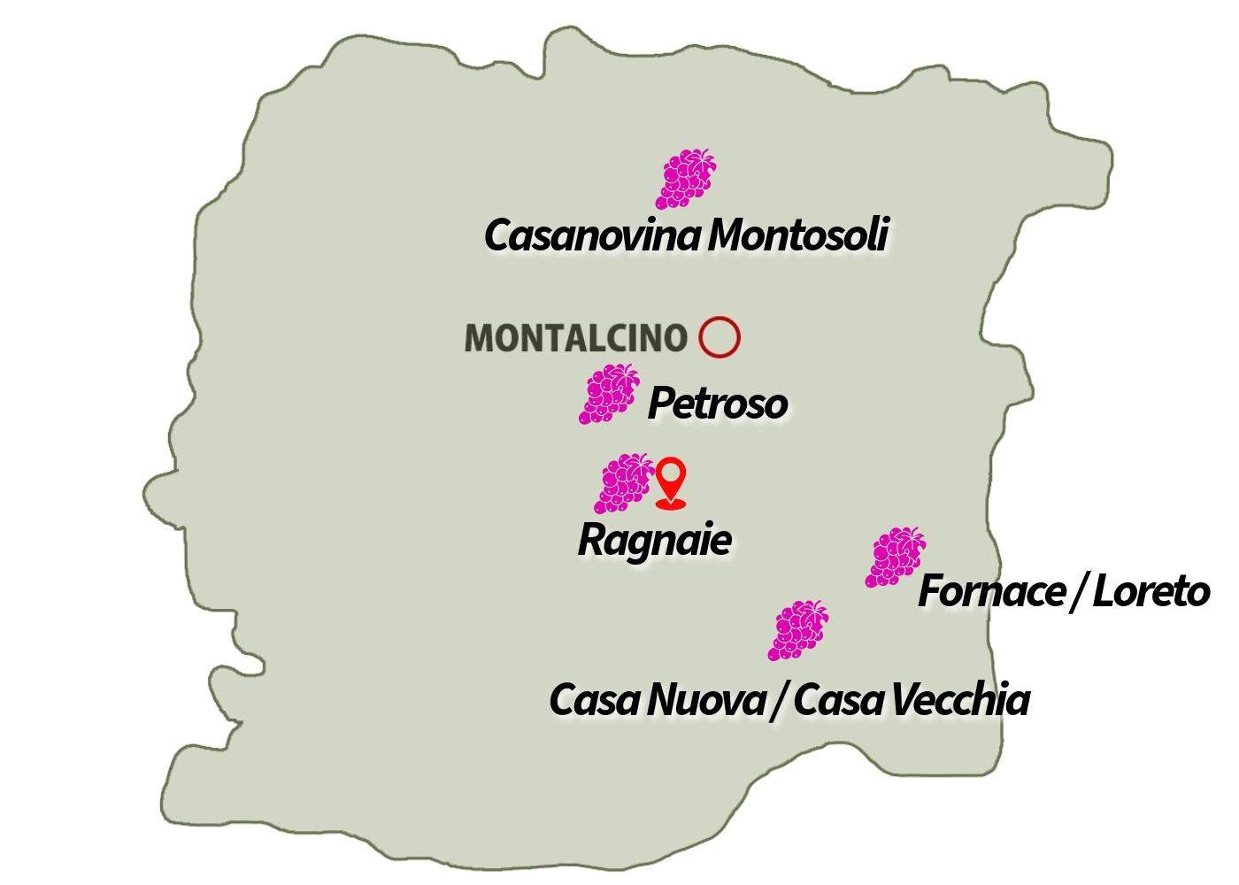 モンタルチーノの北から南にかけて、5つのエリアにまたがる6か所の畑を所有しています。畑の総面積は23haで、そのうちブルネッロとロッソ ディ モンタルチーノの畑は12haです。畑は各地に点在しているので、標高、気候、土壌特性が異なります。