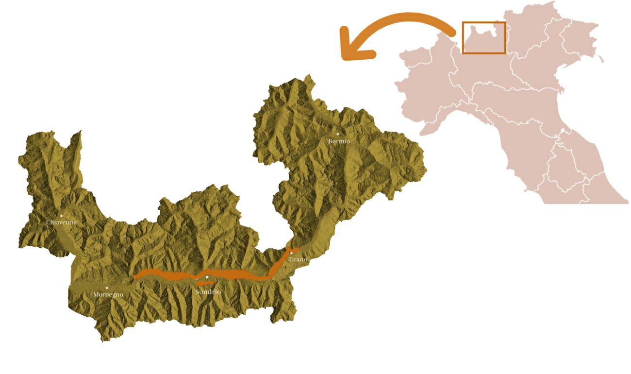 ヴァルテッリーナの地形は独特で、アルプス山脈の渓谷が東西に伸びています。この地形により、すべての畑が南向きになります。冷涼なヴァルテッリーナにおいて、南向き斜面で十分な日照が得られることは、ネッビオーロの成熟を促す最大の要因です。その日照量は、シチリアのパンテレリア島と同等です。