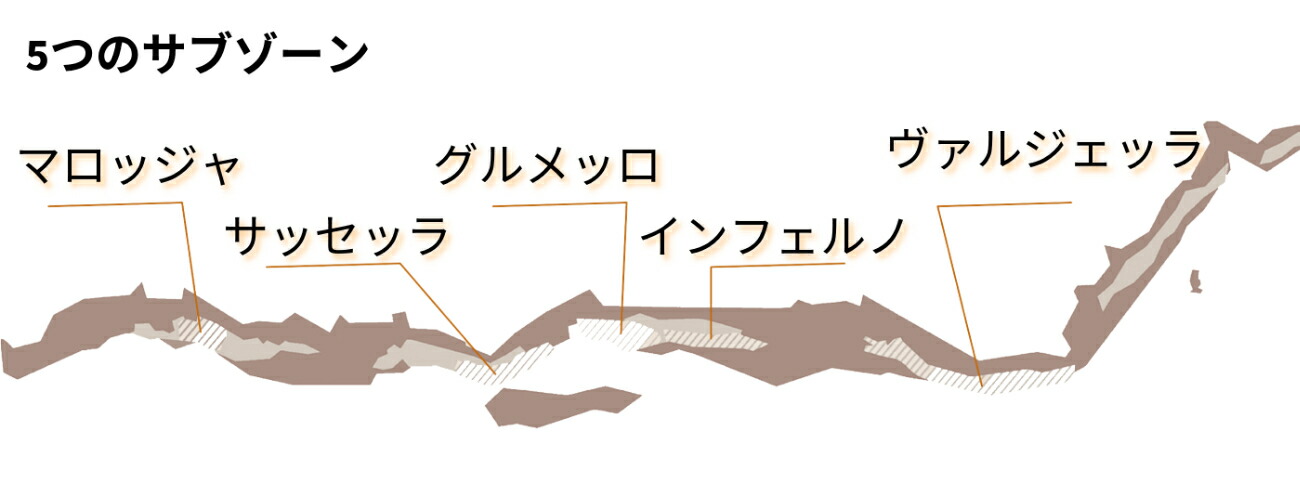 アルプス山脈は数百万年前、ヨーロッパプレートとアフリカプレートの衝突によって隆起し、その副産物としてヴァルテッリーナ渓谷が誕生しました。このため、土壌には多種多様な性質の石が入り混じり、同じヴァルテッリーナでも区画ごとに土壌条件が異なります。こうした背景から、DOCGヴァルテッリーナ スペリオーレはマロッジャ、サッセッラ、グルメッロ、インフェルノ、バルジェッラの5つのサブゾーンに分類されます。