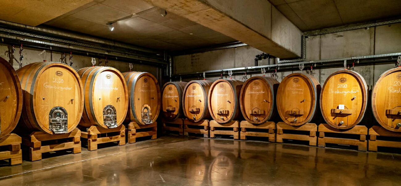 | 坂田さん: 「最も品質の優れた単一畑レッテンのピノ ノワールです。レッテンには1989年、1993年、1997年植樹の区画などがあり、異なるクローンを区画ごとに分けて醸造しています。最終的にすべてをブラインドで試飲し、最も優れたものをレゼルヴやグランレゼルヴにします。年によっては造らないこともあります。2021年は寒く雨の多い年で、非常に難しいヴィンテージでしたが、酸が驚くほど高く、結果的にポテンシャルの高い年となりました。ブルゴーニュの2021年は素晴らしいじゃないですか。ファルツがブルゴーニュに近いこともあるかと思いますが、この年のピノ ノワールは今までで最も良いヴィンテージだと思います。」 |