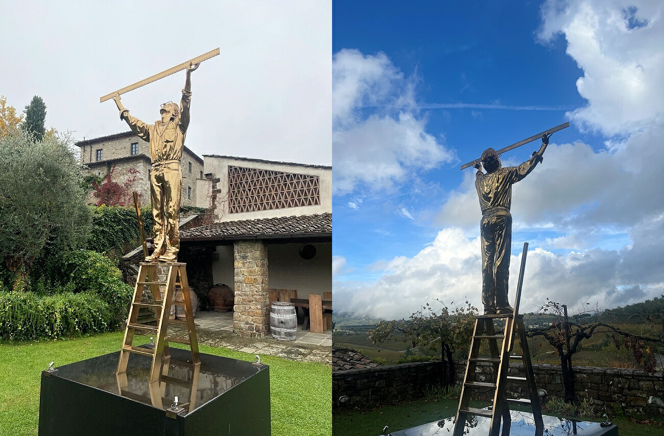 ワイナリーのバルコニーの、畑が見張らせる場所に彫刻を設置しているのですが、それは現代アーティストのヤン ファーヴルの作品「L’uomo che misura le nuvole(雲の量を測る人)」で、フィレンツェのシニョリーナ広場で展示されていたのを買い取ったものです。