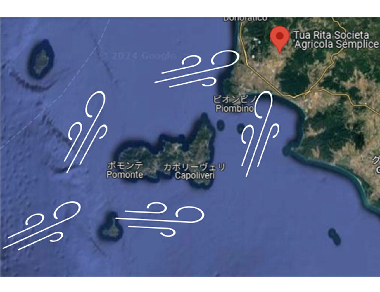 さらに興味深いのが、この土地を吹き抜ける「風」です。海から10kmほどの距離にあるこの場所には、西に浮かぶエルバ島にぶつかり、二手に分かれた潮風が、再び合流して勢いよく吹き抜けていきます。夏の間、絶え間なくこの潮風を受け続けることで、ブドウに独特の塩味のニュアンスが与えられるのです。