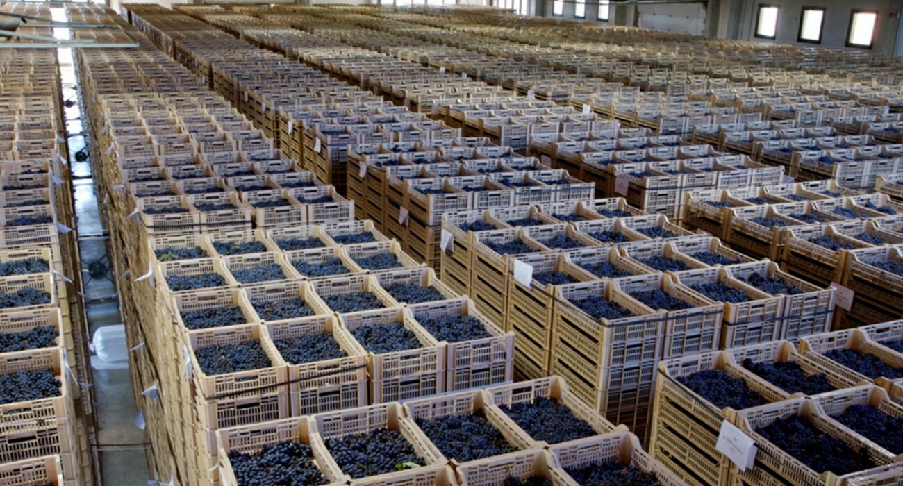 伝統的な陰干し(アパッシメント)製法では、木製の棚にブドウを並べて乾燥させますが、木が持つ湿気がカビの発生を招くリスクがありました。そこで先代フランコ氏は、木製の棚を衛生的なプラスチックのカゴへと一新。果実へのダメージを防ぐため1箱あたりの重量は5kgに制限され、ブドウが重ならないように丁寧に並べられます。