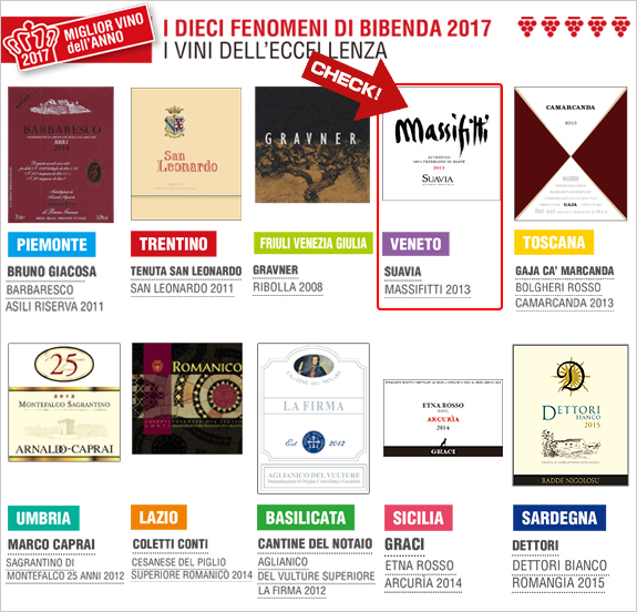 スアヴィアの「マッシフィッティ」2013年が『ビベンダ』2017で最高賞5グラッポリを獲得、さらに、優れたイタリアワインTOP10銘柄のみ与えられる「I Dieci Fenomeni di Bibenda 2017(傑出した10本)」を獲得し、2017年の最高峰ワインの栄誉に輝いています!!