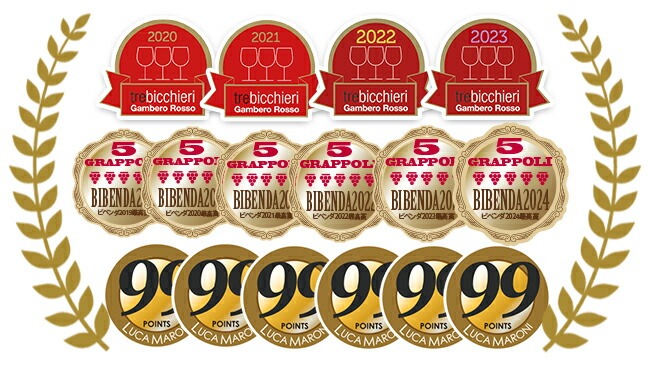 ガンベロロッソでトレビッキエリ(2016-2019、2022)、ルカ マローニで99点(2015-2019、2021,2022)、ビベンダで5グラッポリ(2015-2019、2021,2022)