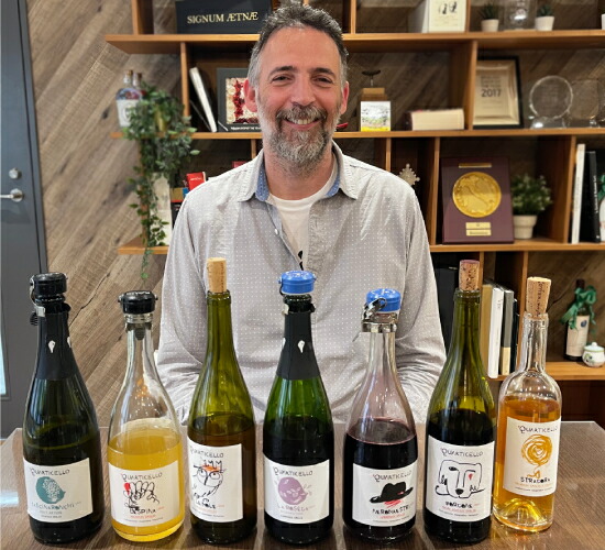 「デスピナは、マルヴァジア ディ カンディア100%をメトド アンセストラーレで造るフリッツァンテです。デゴルジュマンを行わず、澱と一緒に瓶詰めしています。非常に飲みやすく、フレッシュで親しみやすい味わいが特徴です。アロマティックさも特徴のひとつです。私のワインの中で最も販売本数が多く、多くの人に気に入られているワインです。ラベルは、モーツァルトのオペラ『コジ・ファン・トゥッテ』に登場する人物の名にちなんでいます。かつて妻と観に行った思い出の作品です。ラベルのくるくるは、デスピナの髪を表現しています。彼女は浮気を勧めるやんちゃな女性で、その生き生きとしたイメージがワインに合うと感じて名付けました。」