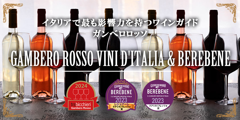 ガンベロロッソ ベーレベーネ(Gambero Rosso Bere Bene) 『ベーレベーネ』は、イタリアで最も影響力のあるワインガイド『ヴィーニ ディタリア(通称ガンベロロッソ)』を発行するガンベロロッソ社が1年間で試飲したワインのうち、イタリア国内市場で20ユーロ以下(※)で販売されているワインについて、特に価格と品質のバランスが優れているワインを「クアリタ/プレッツォ賞」として選出したワインをまとめたガイドブックです。 各カテゴリ(2024年版ではスパークリング、白、ロゼ、赤、甘口、10ユーロ以下の各部門)、および各州ごとの最優秀ワインも選出しています。 2024年版は、試飲した約50000本のワインの中から921本がクアリタ/プレッツォ賞に輝いています。 (※:2024年版の場合。2023年版は15ユーロ以下) |