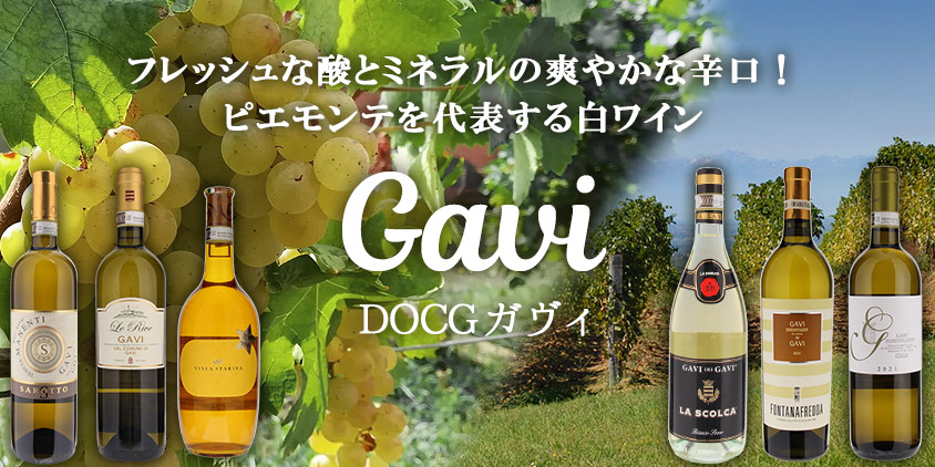 ガヴィは1998年にDOCGに認定されたピエモンテの白ワイン。正式名称は「ガヴィ」または「コルテーゼ ディ ガヴィ」で、ガヴィ村(コムーネ ディ ガヴィ)を含む11のコムーネで造られています。同じコムーネで収穫したブドウだけで造っている場合はワイン名に表記できます。例えば「ガヴィ デル コムーネ ディ ガヴィ」とラベルに表示してある場合はガヴィ村のコルテーゼだけで造っていることを示しています。
