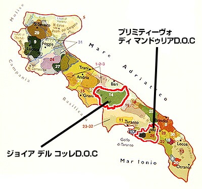 プリミティーヴォの産地として有名なのが「マンドゥリア」と「ジョイア デル コッレ」。この2つはテロワールが異なるためそれぞれに魅力的な特徴を持つプリミティーヴォが造られています。